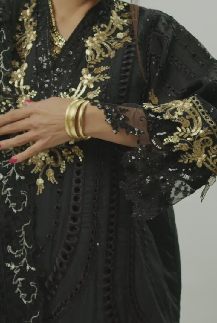Cotton cut work material with a variety of embellishments there’s fine gotta Patti on neck and sleeves. Embroidered organza on hem. Very delicately finished. Paired with a white trouser and soft organza embroidered dupatta.