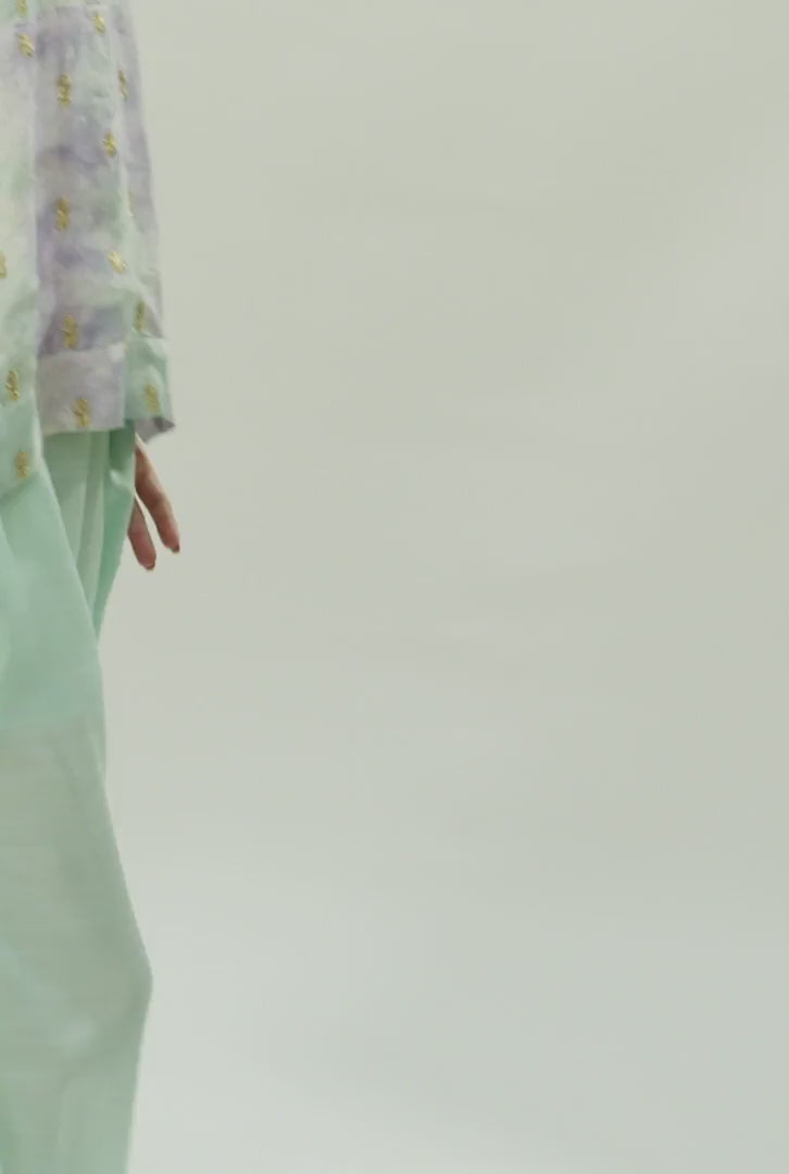 Two piece silk suit in light green and mauve shades with small gold motifs.