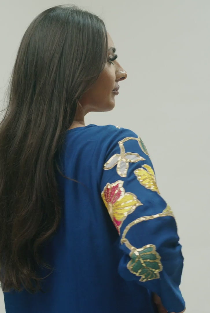 Designed on navy blue soft linen this long shirt with a round neckline has contrast trims with baggy dropped shoulders thus extending dramatic flowery appliqué on dropped shoulder sleeves on a plain background.