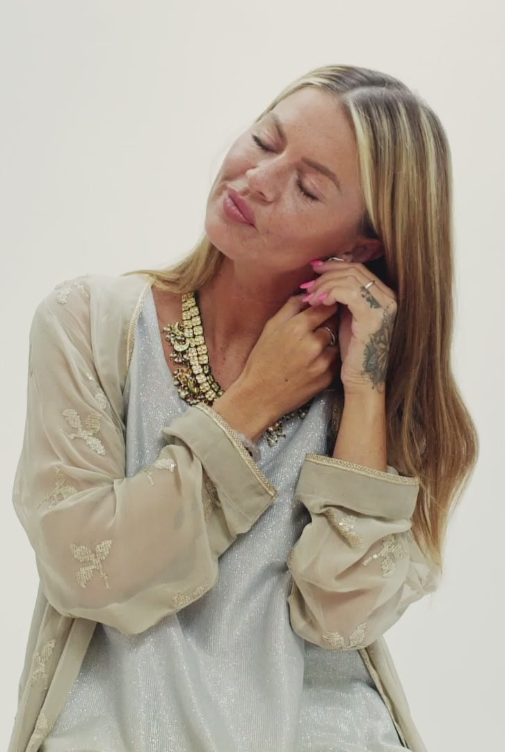 Our Moonlight Fabric is a sheer material that glimmers with a captivating sparkle, perfect for creating breathtaking evening wear garments such as two piece shaded suit with a French chiffon jacket.
