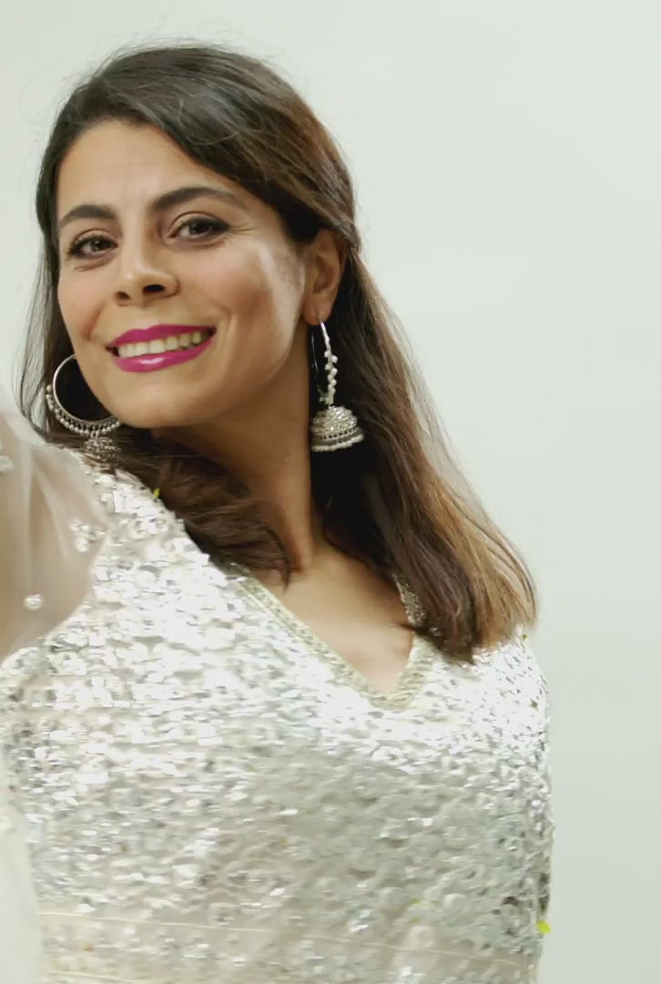 This captivating gown features exquisite handwork in silver foil work cutdana, sequins, and beads, creating a mesmerizing display of opulence that catches the light.