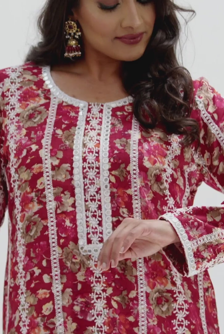 Red cotton shirt with white cotton shalwar with white net.