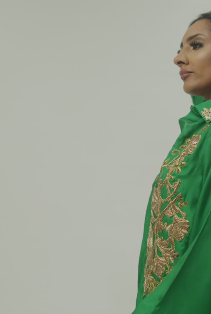 Draped in soft silk satin, this dress is offered in the perfect shade of emerald green. With its signature collar embroidered in gold.