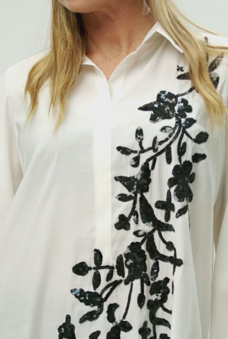 simple white shirt embellished with iconic flower motifs along the front of shirt and across. A perfect edition to elevate your wardrobe. This dress brings you the epitome of luxury with our Couture Embellished Shirt. Crafted from a luxurious feel fabric, this shirt features a hand-embellished collar design that exude showstopping style this versatile piece ensures a modern tailored appearance.
