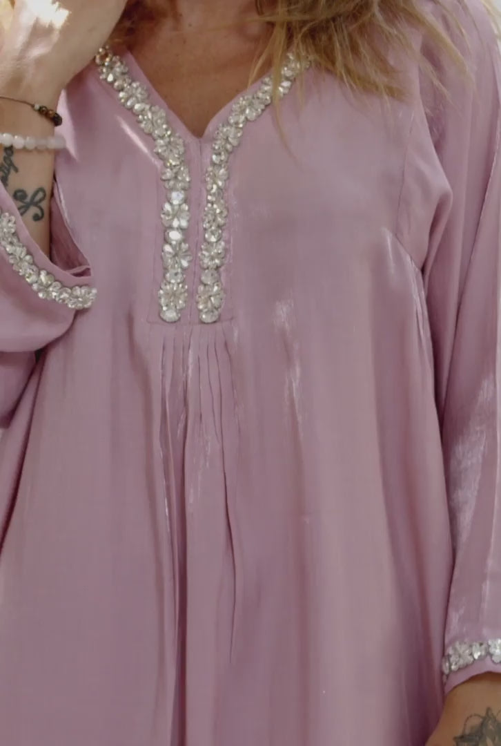 This midi dress features a side pocket with pleats on sides and centre to create a flattering fit that skims the body. This midi dress is styled with trousers. The dress neckline is embellished with Resin Rhinestone Crystal lace.