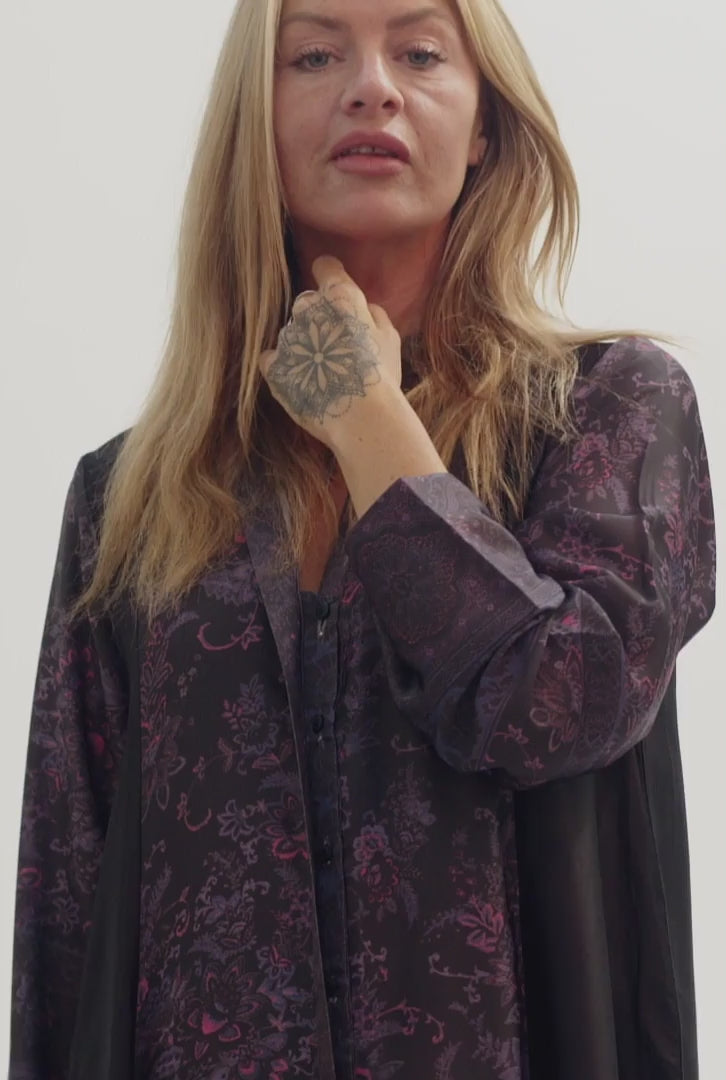Panelled silk shirt with concealed button fastening. Classic Chinese collar; Long sleeves; Panelled flared construction. Panels are joined with ribbon like finish which gives an elegant look. This suit is paired with plain black silk baggy trousers.